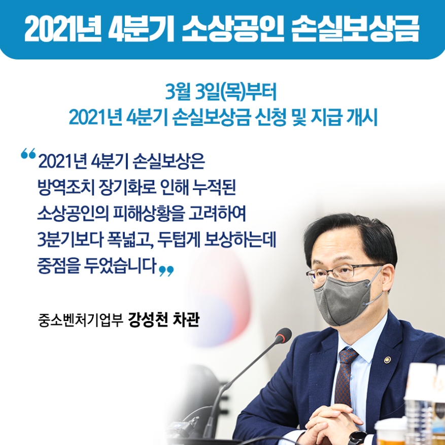 중소벤처기업부는 22년 3월 3일(목) 오전 9시부터 온라인을 통해 4분기 소상공인 손실보상금을 지급합니다.