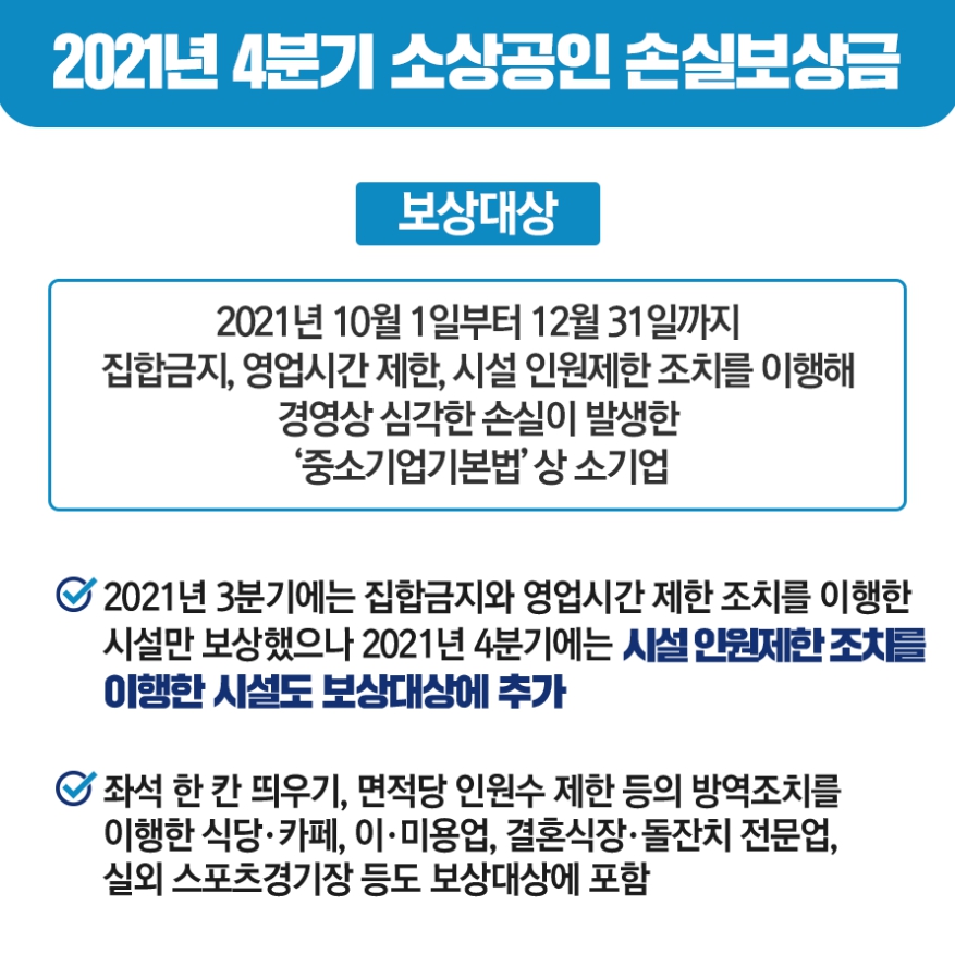 2021년 3분기에는 집합금지와 영업시간 제한 조치를 이행한 시설만 보상했으나 2021년 4분기에는 시설 인원제한 조치를 이행한 시설도 보상대상에 추가했습니다.